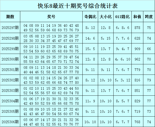 福彩快乐8第2025306期开出奖号:03 06 07 14 17 20 21 31 32 36 44 47 48 51 52 55 61 70 76 77,其中奖号奇偶比开出10:10,大小比开出10:10,和值开出768,跨度开出74,012路比开出6:7:7。