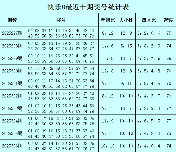 福彩快乐8第2025306期开奖回顾:03 06 07 14 17 20 21 31 32 36 44 47 48 51 52 55 61 70 76 77,其中奖号奇偶比开出10:10,大小比开出10:10,四区比开出6:4:6:4,跨度开出74。